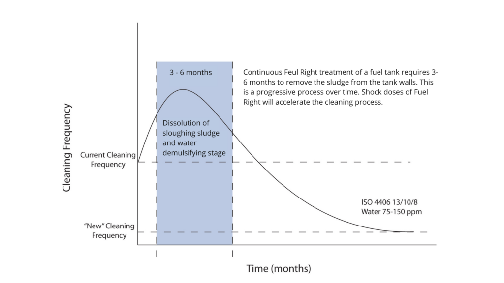 Fuel Right is designed to take a conservative approach to cleaning tanks however, dose rates higher than shock dose can be used to accelerate the process. There are several stages in the cleaning process.