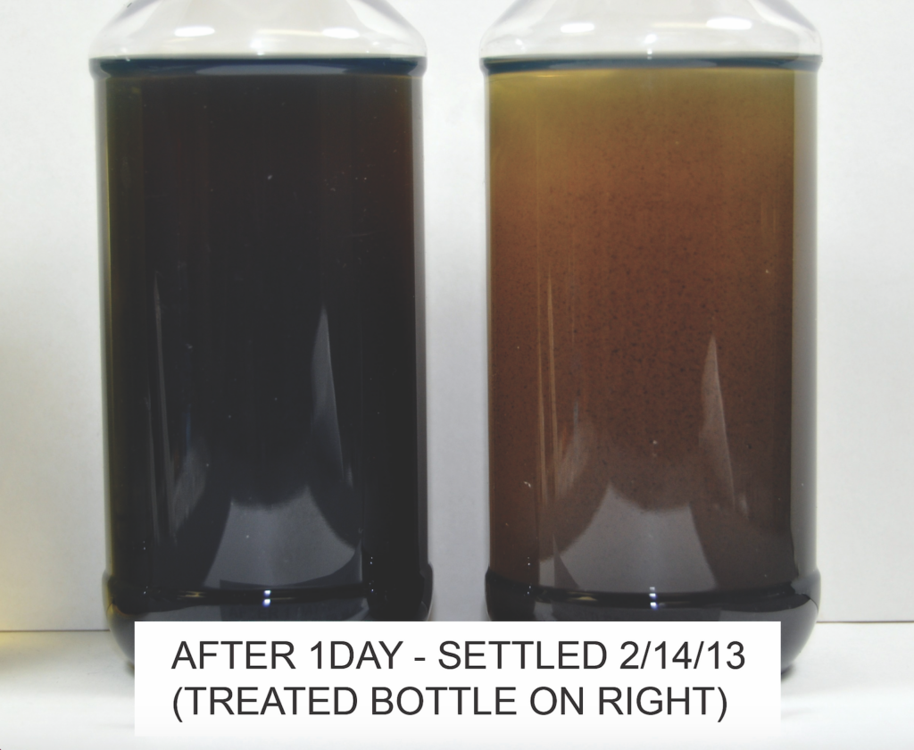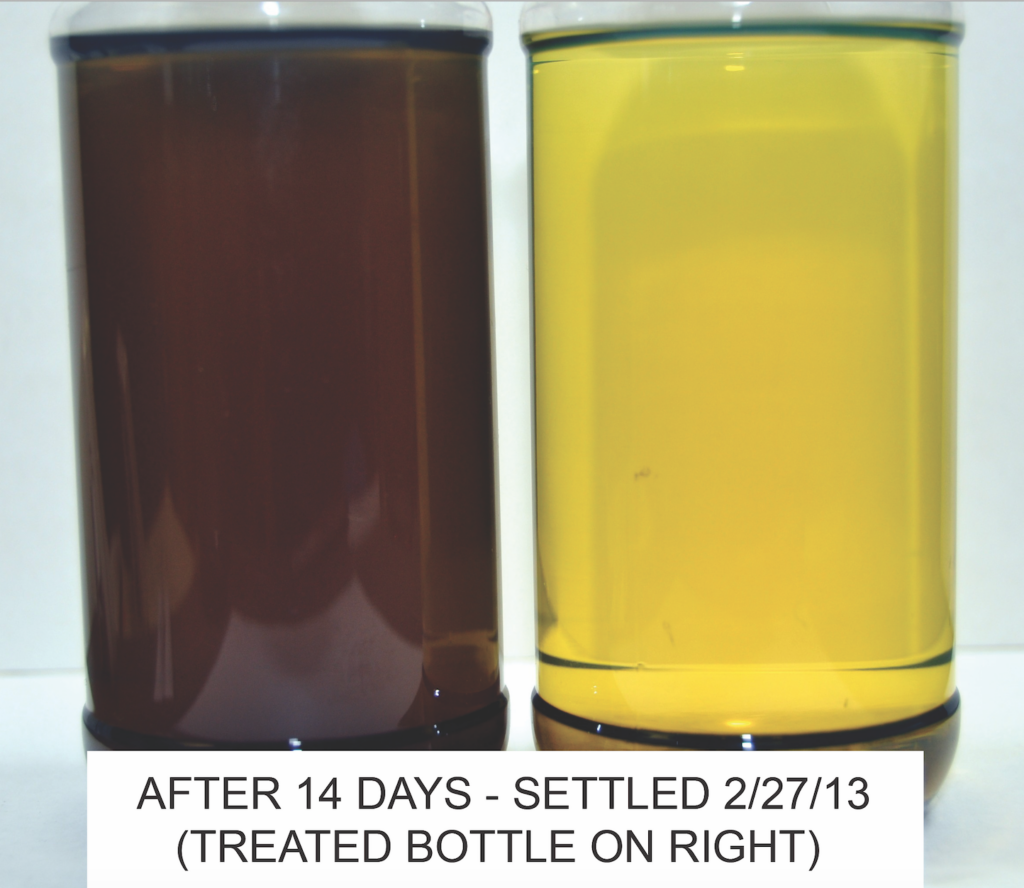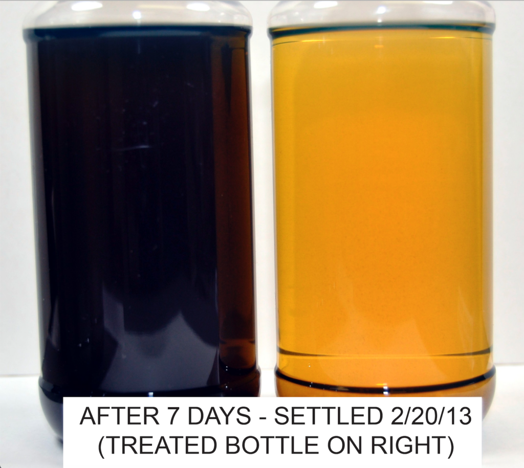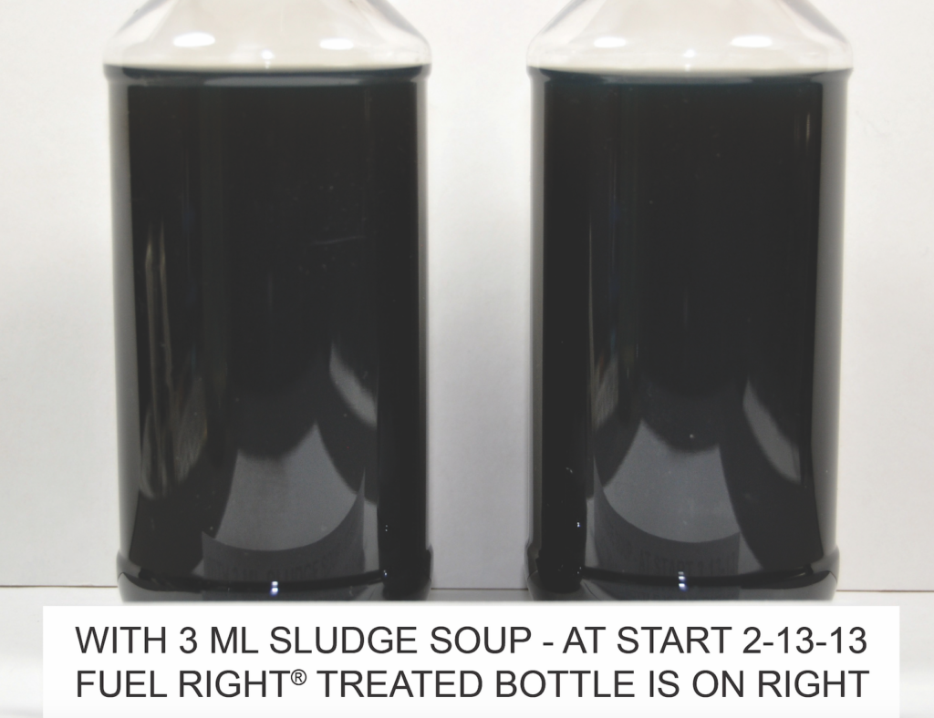 The samples shown were contaminated sludge and then the right sample was treated with a few drops of Fuel Right. The process of dissolving the suspended sludge is immediate. Within the first few days, the fuel is clarified and Fuel Right continues to dissolve any remaining sludge until the fuel is clear of contamination.
