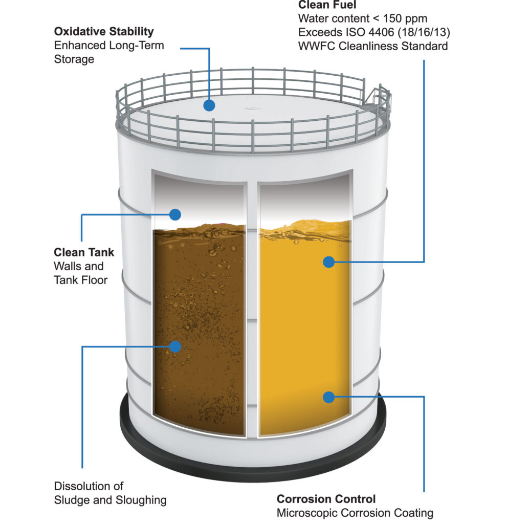 Since the introduction of Ultra Low Sulphur Diesel (ULSD), the industry has seen increased challenges associated with fuel instability, water contamination and microbial related sludge formation within storage tanks. These conditions can contribute to corrosion, increased maintenance requirements and premature fuel system deterioration if left unmanaged.
