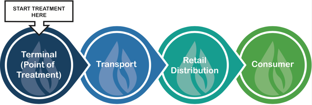 The further upstream you treat, the better results you will achieve. As Fuel Right cleans the main terminal storage and protects it from sludge contamination and corrosion, the fuel delivered downstream will provide the same benefits throughout the fuel system.