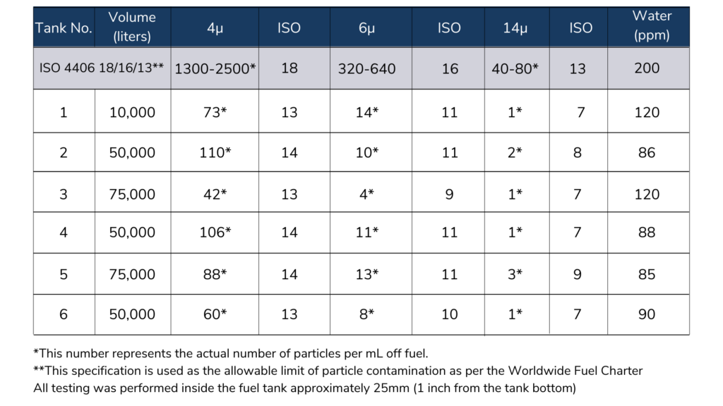 We have monitored many field tanks to determine how effective Fuel Right is at cleaning and maintaining fuel cleanliness based on the Worldwide Fuel Charter. Using various equipment such as laser particle counters and sending field samples out to independent laboratories for testing, we have consistently validated that Fuel Right plays a significant role in cleaning and maintaining a fuel cleanliness standard multiples cleaner than the current Worldwide Fuel Charter.